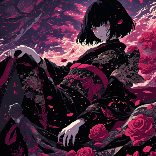 intricate digital illustration art painted in the style of matisses fashoion illustration,dreamy holy hevenly ethereal fantasy magic painting beautifullighting elegant sophisticated in the style of bold line,whole body,dark anime style,japanese manga style, horror movie poster with a girl with a bob cut wearing a kimono is playing the kimono and scattered rose in the dark forest midnight --niji 6 --s 750 --style raw