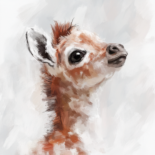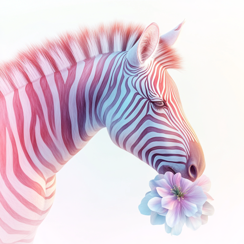 a mother zebra for a children's bedroom painting, soft watercolor style with very gentle colors, the zebra is in profile view, lowering it’s head down towards a flower at it’s chest, minimal detail on the fur, set against a clean white background, high-resolution, vibrant pastel tones, natural light, photorealistic rendering, 8K.