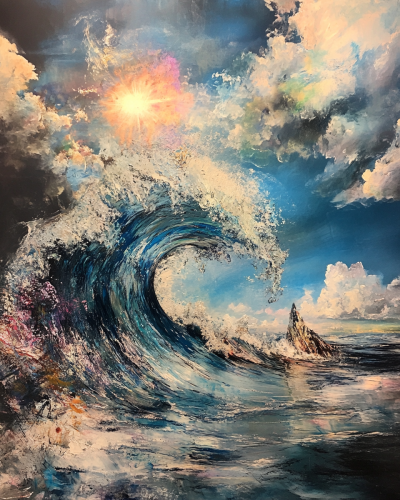 Imagine a giant wave rolling, inspired by Japanese woodcuts , show how the light is reflected on the water, depiction is also inspired by Sisley’s delicate landscapes and Claude Monet’s loose, fast brushstrokes. Use soft blues, greens, and touches of white to create shimmering effects. Show how reflections add depth and atmosphere to the scene, keeping strokes loose and fluid. --ar 4:5 --p teqj53c --s 500