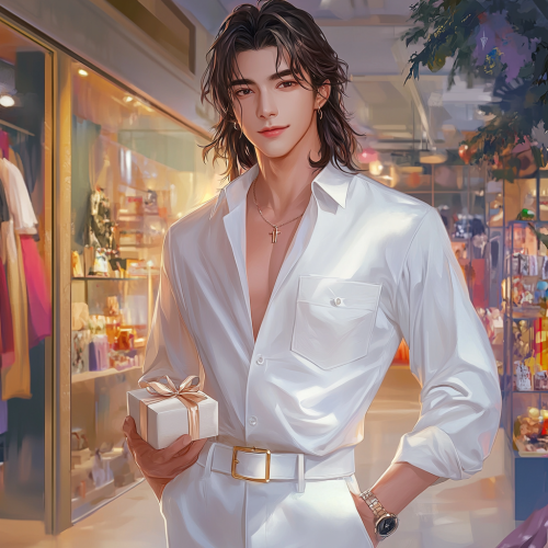 manhwa painting artwork style. Handsome, fashionable and groomed man with strong jawline, full lips, long styled hair, man looks cheerful and mischievous. White high fashion clothing. Standing alclove of french mall, with a small gift box. Background is very detailed, vivid colors and high contrast of lighting, high detail, best quality. Natural lighting.