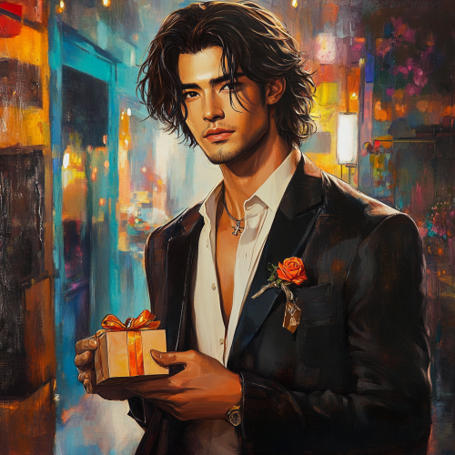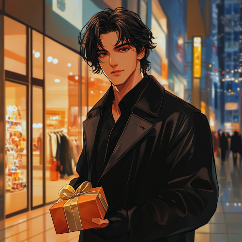manhwa painting artwork style. Handsome, fashionable and groomed man with strong jawline, full lips, long styled hair, man looks cheerful and mischievous. Modern, high-fashion clothing. Standing alclove of french mall, with a small gift box. Background is very detailed, vivid colors and high contrast of lighting, high detail, best quality. Natural lighting