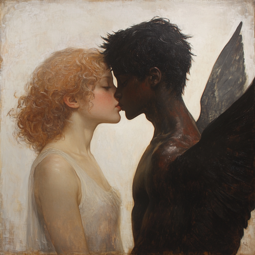 Two cupids, both with wings, One with angelic aura and the other is dark aura, kissing on the cheek in the style of William-Adolphe Bouguereau. The left cupid is a female with light curly hair, a white background, and the right angel is a male child with dark red skin, grey eyes, sharp black wings, and looking down away from the kiss , with a soft light illuminating the scene. Inspired by the painting THE FIRST KISS by William-Adolphe Bouguereau