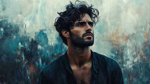 artistic Painting portrait of a 25 year old man, dark black hair, light but dark beard and brown eyes, light skin tone, sad and somber expression, rough navy blue shirt, outdoor sitting on the bench, natural lighting --ar 16:9