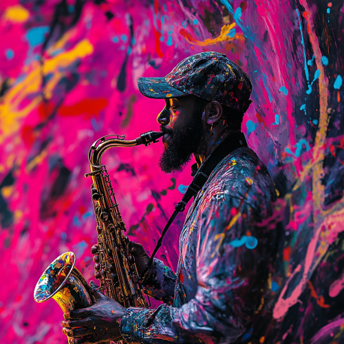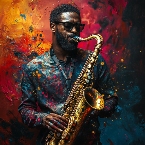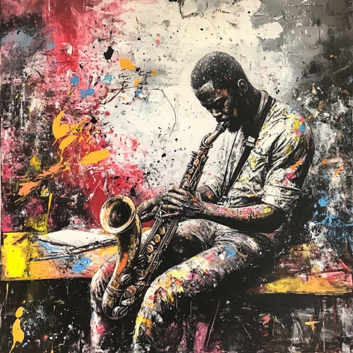 Can you create me a african male playing the saxophone paint splatter, drip, and splash in Abstract Expressionism. Super detailed, Chiaroscuro, smooth