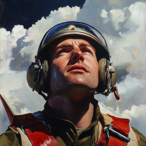 sref:: classic jack vettriano painting of fighter pilot in front of his plane with thunderclouds and smoke in the background. Medium close up shot. V 6.1