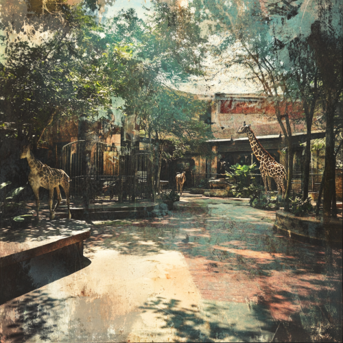 a low angle shot of a zoo courtyard surrounded by different animal exibits. Its painterly in texture and drawn in an impressionist style. There are no humans on the pathways. In the exhibts we also dont see animals.