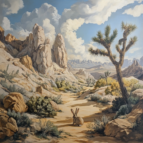 The classical painting of A Secret Message by Francois Boucher but with a desert hare, the enviroment is a desert, with joshua trees, oil painting, traditional media