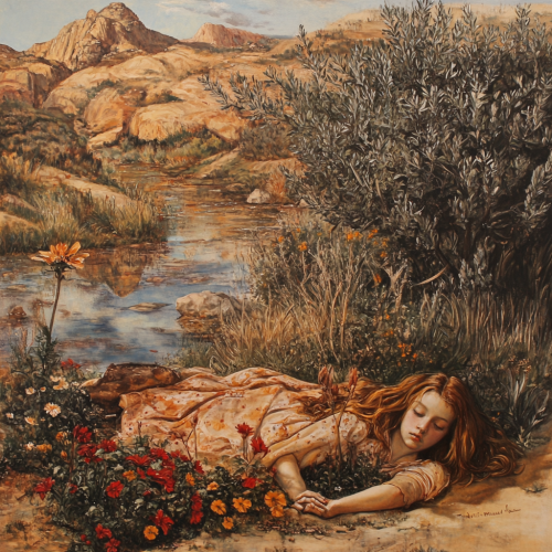 The classical painting of Ophelia by Sir John Everett Millais but with a rabbit, the enviroment is a desert, with joshua trees, oil painting, traditional media