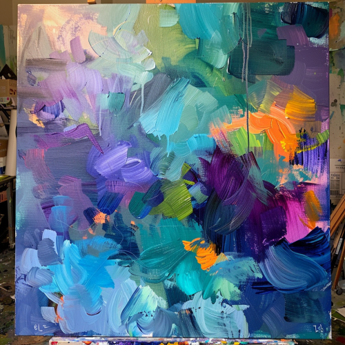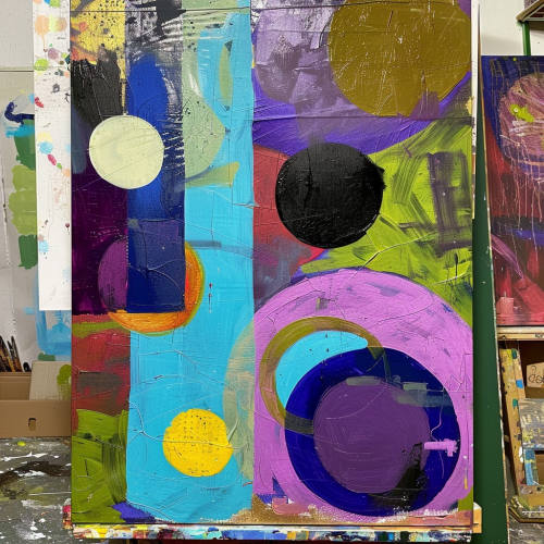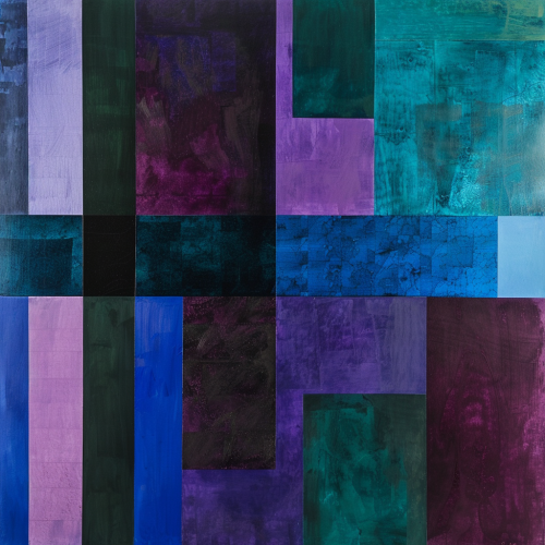 I plan to paint an abstract piece inspired by Joni Mitchell’s Both Sides Now. The artwork will use large, contrasting shapes with a base of blue, purple, emerald, and peacock green --v 6.0