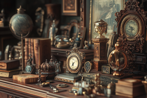 Realistic photo of an array of fine art pieces and antique artifacts, each item displaying rich textures and timeless details, highlighting the historical and artistic value inherent in the collection. Photo realistic, realistic image, 8K resolution