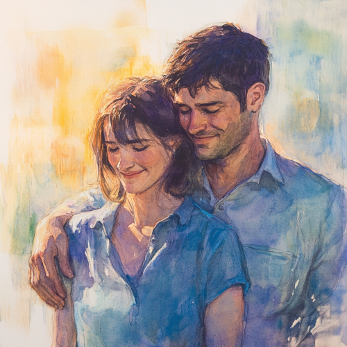 a watercolor paiting of a man sitting at a piano. It should be shot from behind him, only seeing his torso sitting at the instrument, he is facing away from the camera. Should have strong and defined lines, while the rest of the image is soft pastels, purple and light blue