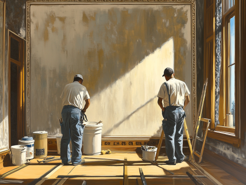 Create a realistic scene of two professional painters of latino decent applying finishing touches to the interior of a large room . The painters are carefully working on the final details, with tools and paint supplies nearby. This image is intended to be a feature on a commercial painting website, showcasing quality workmanship and attention to detail. --ar 4:3