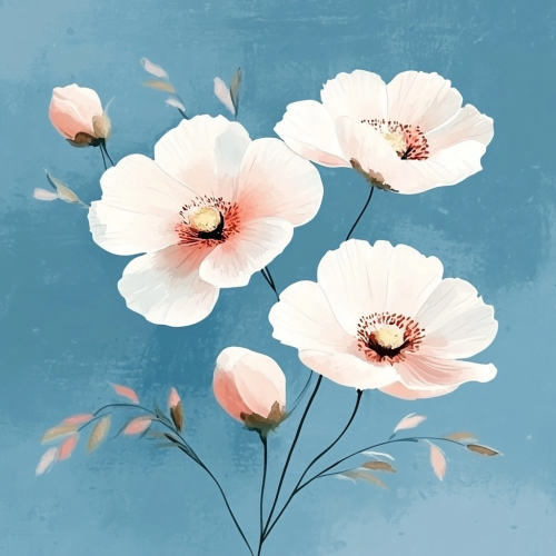 A beautiful painting of white and pink flowers, on blue solid background, vintage style drawing, watercolor style, soft brush strokes, delicate details