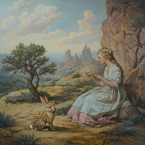 The classical painting of A Secret Message by Francois Boucher but with a rabbit, the enviroment is a desert, with joshua trees, oil painting, traditional media, rococo painting, a woman giving a message to a rabbit