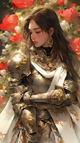 the painting of an elegant woman in armor, in the style of ethereal illustrations, dollcore, hyper-realistic pop, light gold and white, gongbi, realistic hyper-detail, flowerpunk --ar 9:16 --niji 5