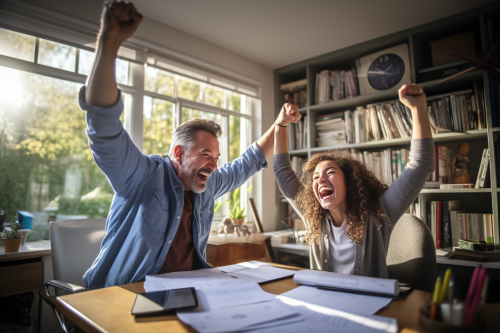 photorealistic father and daughter high fiving over completed homework, their faces beaming with pride and excitement, surrounded by a neat and organized desk with textbooks, notebooks, and a laptop, in a modern and brightly lit home office, creating a professional and productive environment, captured in a realistic photography style with a portrait lens (e.g. Nikon AF-S NIKKOR 85mm f/1.8G) set at a focal length of 85mm and an aperture of f/2.8, emphasizing their expressions and creating a shallow depth of field. --aspect 3:2