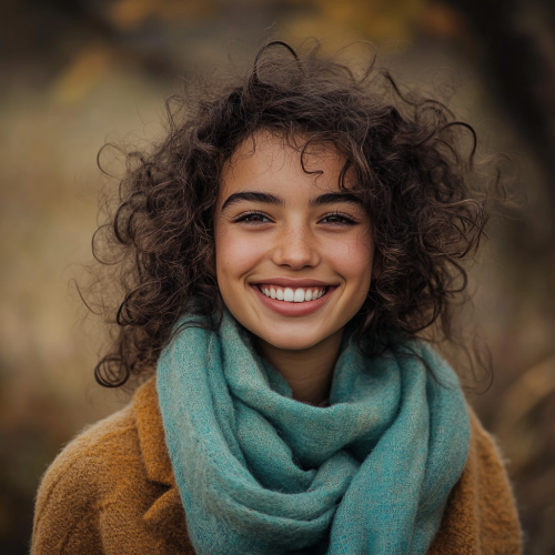 A cheerful European girl with curly hair, smiling warmly in an outdoor natural setting. She is wearing a cozy outfit with a light turquoise scarf . The girl's smile brings warmth to the