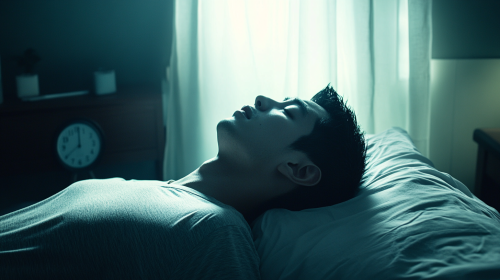 Chinese man who looks like a runner, lies on his back in the bedroom, light filtering in as he stares up at the ceiling, reluctant but gathering determination, an alarm clock is in the frame --ar 16:9