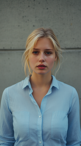 A woman, facing camera, eyes looking at camera, 28 years old, is captured walking outdoors, dressed in a pastel blue shirt. Her expression is thoughtful and slightly stern, with her lips slightly parted as if deep in thought or mid-conversation. She has blond, slightly disheveled thin hair. The background temperature is grey with fades. --ar 9:16