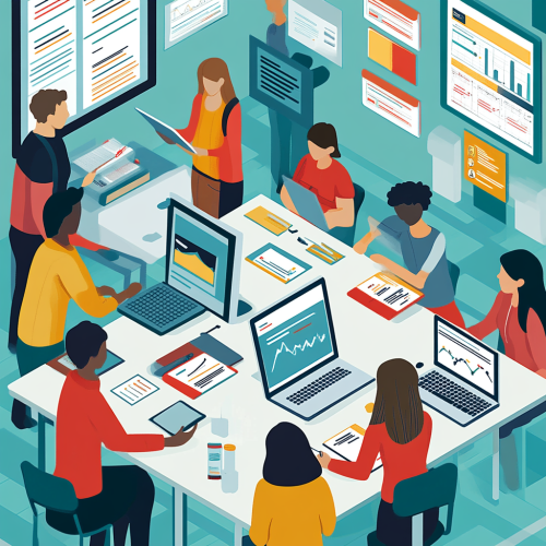 Create a clean, vector-style illustration of a school setting where educators and administrators are gathered around a table, reviewing different learning management system options on laptops and tablets. The scene should include a diverse group of people, with charts, checklists, and comparison screens visible. The background features modern educational elements like books, digital devices, and whiteboards. The illustration should have a professional yet approachable style with bright, clear colors and minimal detail, focusing on clarity and the decision-making process.