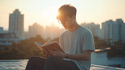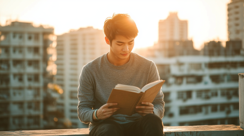 Capturing a asian young man quietly reading a book on a rooftop, enjoying the moment, The sunlight fell on him, sunny day, light tone, Kodak film, wideshot, emotion, breathtaking city. clean rooftop --ar 16:9 --v 6.1