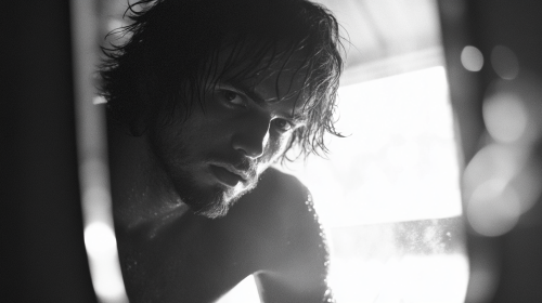 16mm analogue still, sunlight softly coming in, A man stares back at their reflection in the mirror. They’re covered in sweat and slightly out of breath with long, shaggy hair. They’re a little bit out of shape. They look down the barrel of the camera, and as they speak. --ar 16:9