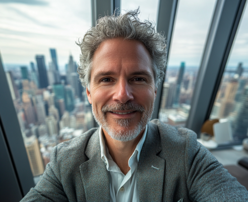 A selfie of a 50 years old man sitting in front of a large window in a modern minimal office at the 30th floor and in the background you can see New York City. He is smiling. Hair are mid-lenght and salt-and-pepper. The man is wearing an elegant causal jacket and a white shirt. taken with a Canon EOS R5. In a very realistic photo style --ar 40:33