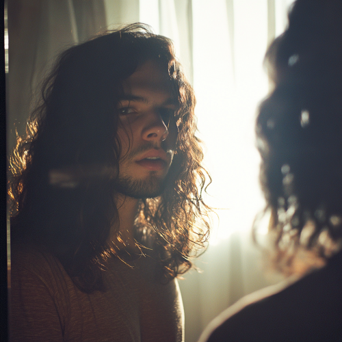 in colour, 16mm analogue, bright, a young and overweight, sunlight softly coming in, bright, A man with long hair, the hair is so long its on his shoulders , stares back at their reflection in the mirror. They’re covered in sweat and slightly out of breath with long, shaggy hair. They’re a little bit out of shape. They look directly to camera facing the front, standing in centre frame, colour