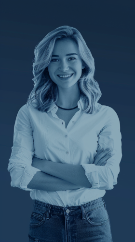 from the waist up of a woman in a white smart shirt and some jeans smiling holding folding his arms infront of a navy blue gradient background --ar 9:16 --v 6.0