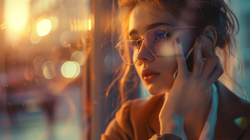 create a person who is smartly dressed and talking on the phone, natural bright light, depth of field, photorealistic, commercial photo, high details, beautiful composition, hd quality, vibrant colors, shallow depth of field, natural look --ar 16:9 --v 6.0