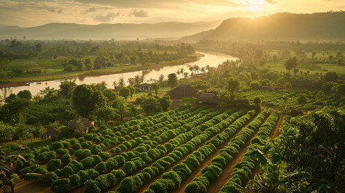 A picturesque aerial view of the Kampot region in Cambodia, highlighting vast and meticulously maintained pepper plantations stretching across the landscape. Rows of vibrant green pepper vines are clearly visible, basking in the warm, golden hour sunlight that creates a soft, inviting glow. A calm river winds gracefully through the valley, reflecting the sunlight and enhancing the serene atmosphere. In the distance, traditional Cambodian houses sit peacefully amidst the greenery, hinting at the region’s rich agricultural heritage. The scene is designed to evoke a sense of connection to nature, quality, and tradition. Created Using: landscape photography, golden hour, wide aerial view, tropical setting, smooth color gradient, natural lighting, hd quality, vivid style --ar 16:9 --v 6.0 --s 250