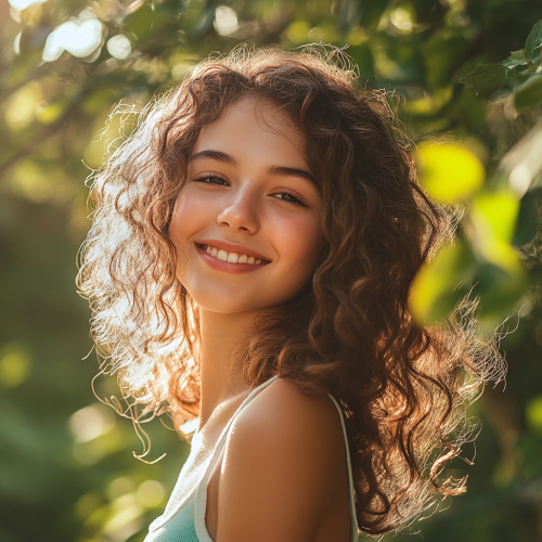 A cheerful European girl with curly hair, smiling naturally, standing outdoors in a serene, natural setting. She is surrounded by soft greenery and gently flowing light. Scattered around her are a few turquoise objects, such as a water bottle and a light throw blanket, adding a refreshing pop of color to the scene. The girl’s expression is warm and inviting, with soft sunlight illuminating her face and hair, creating a tranquil, carefree atmosphere. Photorealistic, with a focus on the harmony between nature and the subtle turquoise accents. Commercial photography style.