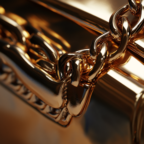 close up of a realistic bag which has a minimalist and elegant chain strap made of gold metal and. This is a fashion photography shot, paco rabanne style, glamour with a minimalist background