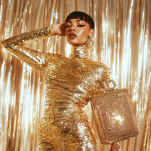 A high-fashion editorial photo shoot in the style of Paco Rabanne, featuring a glamorous female model dressed in a luxurious golden outfit. The outfit should be metallic and reflective, adorned with signature futuristic designs, evoking Rabanne's avant-garde fashion. She carries an iconic Paco Rabanne chainmail bag made from gold can tabs. The scene is set against a minimalistic, high-contrast backdrop with soft lighting that highlights the shimmer of the gold fabric. The overall aesthetic is bold, modern, and ultra-glamorous, capturing the essence of Paco Rabanne’s signature futuristic, metallic glamour.