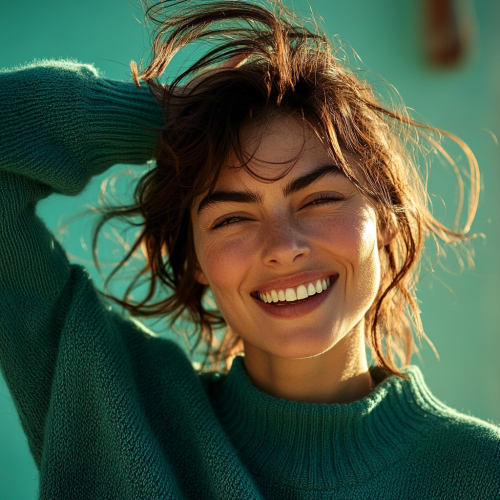 A candid outdoor portrait shot taken with a Sony Alpha A7, featuring a romanian woman with natural, imperfect beauty and vibrant, healthy hair. The dynamic angle captures her smiling energetically, one hand playfully running through her hair. She is dressed in a casual, long-sleeved outfit, like a turqoise pullover. The natural light enhances her authentic, relatable appearance, while the soft, nature-inspired turquoise background blends seamlessly with the outdoor setting. The shot feels lively, real, and perfect for a hair product campaign that emphasizes genuine beauty. Photorealistic, commercial photography style.