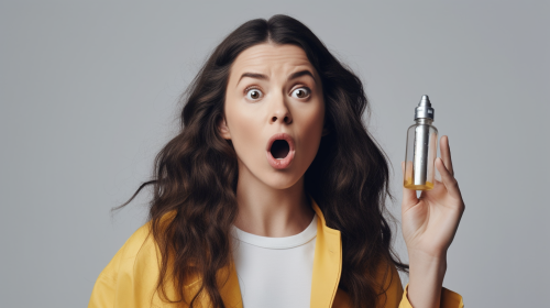 hyper real photo of a woman with dark long hair, behind shoulders. She is standing against a white background in a studio setting. she is wearing a bright yellow lab coat holding up a small tube of face cream. She is talking and looking to camera, mouth open. She is friendly. --ar 16:9 --v 5.0 --s 750