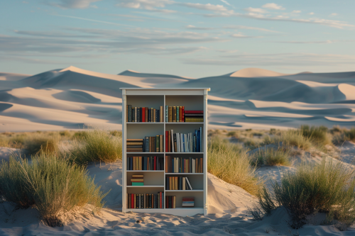 Estanteria estrecha pequeña de ikea blanca con libros dentro. La estantería esta en mitad de un desierto de dunas. Atardecer. Paisaje precioso. Cinematic. Shot with sony DSLR, ultra details, high ddefinition, --ar 3:2 --v 6.0