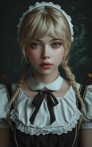 photo realistic, hyper realistic portrait of maid, blonde , beautiful, gorgeous, cinematic, studio ghibli, dark background --ar 10:16 --v 6.0