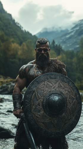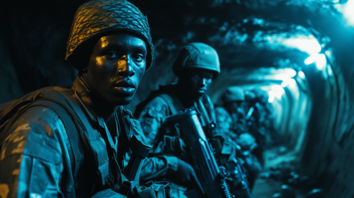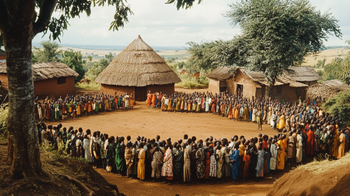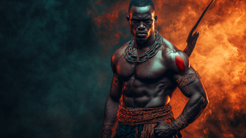 cinematic scene of an African man.Towering figure, at least 20 feet tall, Muscular build, with broad shoulders and powerful limbs,Traditional waist cloth wraps around his waist, now resembling a majestic sash,Intricate tribal markings adorn his arms and chest, glowing softly in the dark This visual representation captures the essence of African mythology. on half of the image is dark and the other is bright. he has red markings on his face.This is an ultra-realistic photograph captured on high-resolution 35mm film. --ar 16:9
