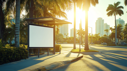 Place: Panama. Image: cinematic studio photography of bus stop with a vertical white screen, solid and structured at the street sublte very rich and wealthy neitghborhood, mansions in miami, soft shadows slightly blurred sunny day --ar 16:9