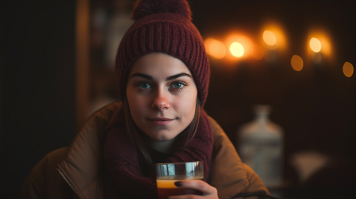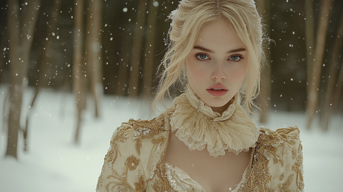 A regal young woman stands in a snow-covered forest, slightly offset to the right of the frame, her piercing blue eyes maintaining a direct, captivating gaze. Her blonde hair is styled in an elegant updo with loose strands, adorned with delicate pearls that glisten like the falling snow. She wears an opulent, high-collared coat with intricate golden embroidery and embellishments, exuding a sense of nobility and grace. Snowflakes gently fall around her, and the background is filled with tall, blurred trees fading into a misty, wintry atmosphere, adding depth and a mystical quality to the scene. The cold, ethereal environment contrasts with her warm expression, creating an image of a powerful, enigmatic figure commanding her magical winter domain. Cinematic film still, shot on v-raptor XL, film grain, vignette, color graded, post-processed, cinematic lighting, 35mm film, live-action, best quality, atmospheric, a masterpiece, epic, stunning, dramatic --ar 16:9 --fast --style raw --personalize kwgh21a --stylize 400 --v 6.1