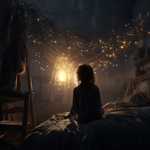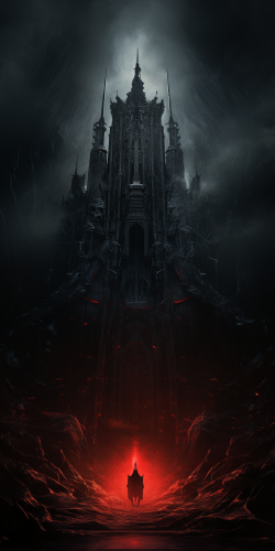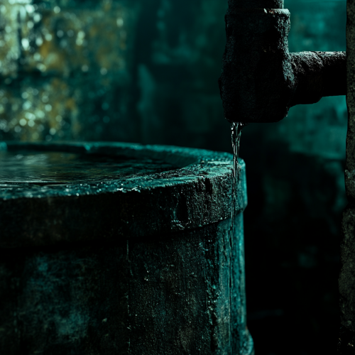 Close-up of a colonial water well, The high contrast between light and shadow, along with a dark green and dark cyan color palette, creates a cinematic composition that captures the grandeur of evil