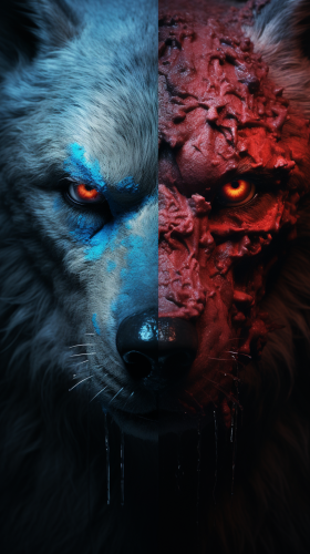 futuristic and cinematic photography, a mad wolf in the middle with half red and half blue face, amazing light, very realistics textures, skin realistic , ultra - detailed photography, immersive visual shot taken with a hasselbald professional camera --v 5.2 --ar 9:16