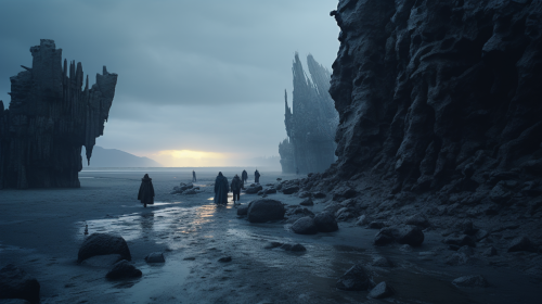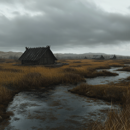 a dark fantasy tundra 3d environment that is cinematic and dark yet beautiful there are small huts in the back round as if inhabited by some pagan people greenish grey vibes the grass is dead and dry and there are ponds everywhere