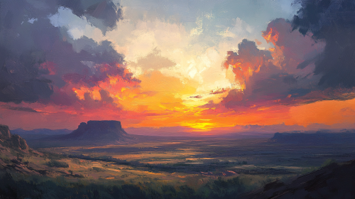 Sunrise over vast Arizona landscape. Cinematic, moody lighting. Painterly in the style of Sargent and Joaquin Sorolla. Large bold brush strokes. --ar 16:9