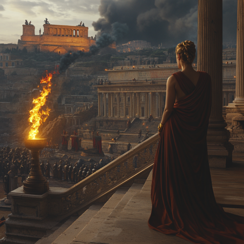 Athena stands poised in an elegant, shadowy library, her dark robes draping gracefully over her figure, with a golden belt accentuating her waist. She holds her spear lightly, her eyes thoughtful yet captivating. The candlelight casts a warm glow on her face, highlighting her refined beauty and confidence cinematic, 4K --ar 16:9