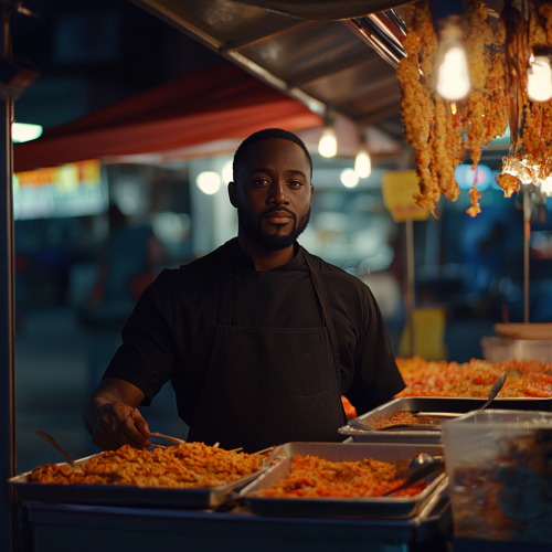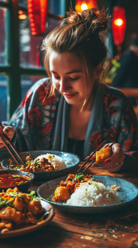cinematic, photo, beautiful women, man, boy, girl, eating rice, fried chicken, tofu, chili on the side, ultra wide, captured by hasselblad X1D --ar 9:16 --style raw --v 6.0