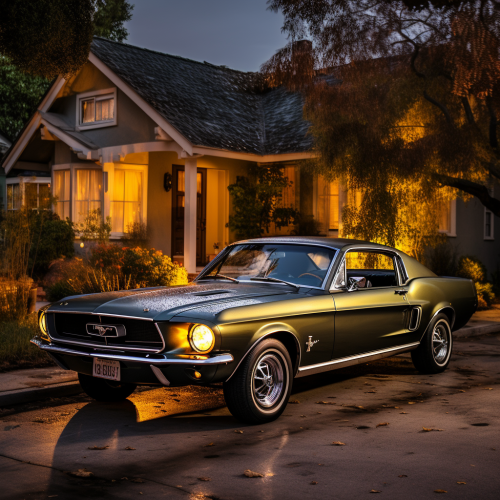 picture of a beautiful majestic 1968 Mustang, american houses in the background, illuminated, bright, clear features, Cinematic, 35mm lens, f1/ 2, accent lighting, golden light, global illumination, soft shadows, no contrast, professional color grading, modern photography, detailed, studio lighting, wide angle --v 5.2