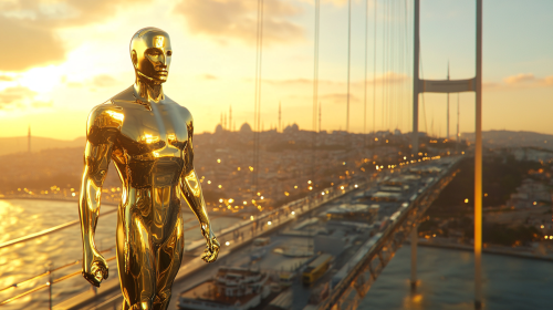 3D-rendered Oscar statuette walking across the Bosphorus Bridge in Istanbul at sunset. The golden, reflective surface of the statuette shines brightly, contrasting with the soft, warm light of the sky. The iconic suspension cables of the bridge stretch across the scene, with the Istanbul skyline, featuring minarets and modern skyscrapers, in the background. The calm waters of the Bosphorus flow below, as the statuette moves confidently, creating a surreal, cinematic atmosphere. --ar 16:9