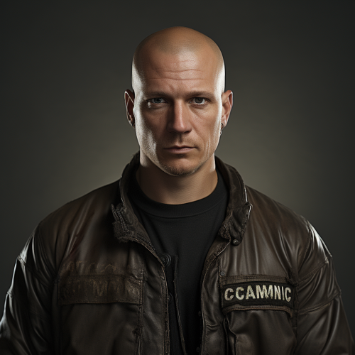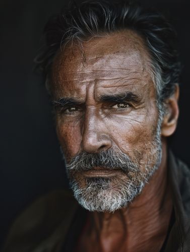 hyper-realistic photograph of a strong, virile 50-year-old Brazilian man with a confident gaze, light tan skin, and well-groomed, slightly graying beard, conveying masculinity and authority. Styled in a way that evokes the charisma of iconic characters from Peaky Blinders, Sons of Anarchy, Breaking Bad, and The Godfather, with an intense, reflective expression. Lighting is dramatic, with subtle chiaroscuro highlighting the contours of his face. Shot with a Leica 50mm, Kodak Portra 800, f/1.4, for a moody, cinematic effect. --ar 3:4 --v 6.0